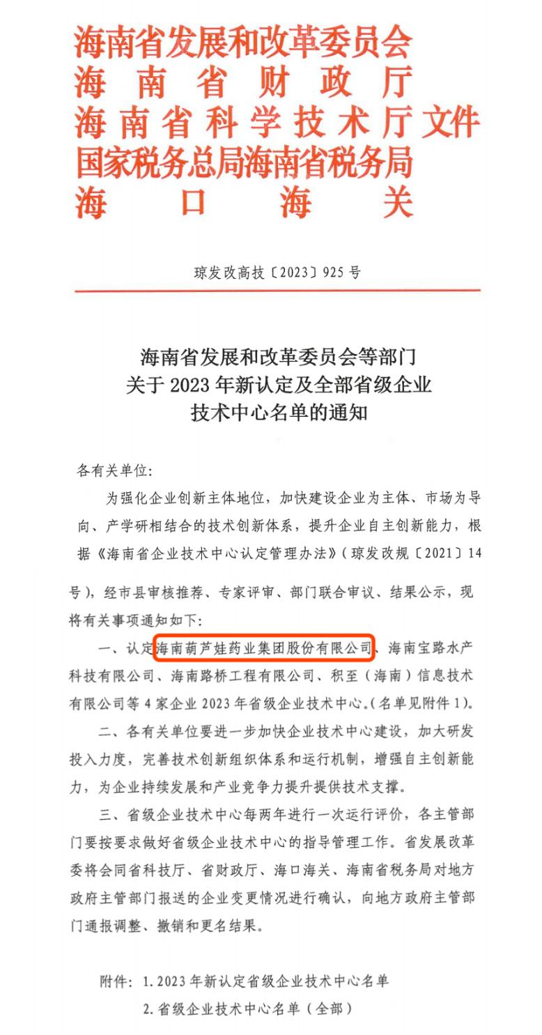 近日,海南省发改委等多部门联合公布了《关于2023年新认定及全部省级企业技术中心名单的通知》,其中,海南304am永利集团药业集团股份有限公司成功通过评审,被认定为省级企业技术中心,是本次获批的4家企业之一。